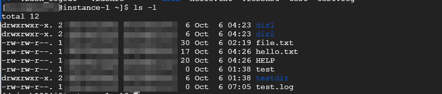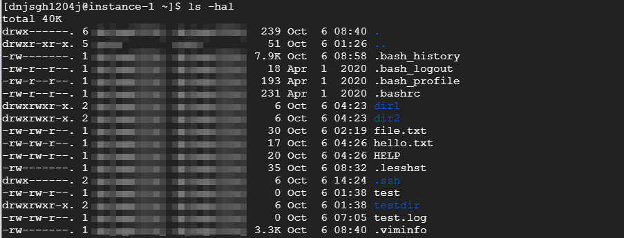 -l 엘! 폰트바꿔야지! 리스트 형태로, 권한(다음에 설명) 만든날짜 시간 user와 group (모자이크) 다 보여준다. ㅎㅎ