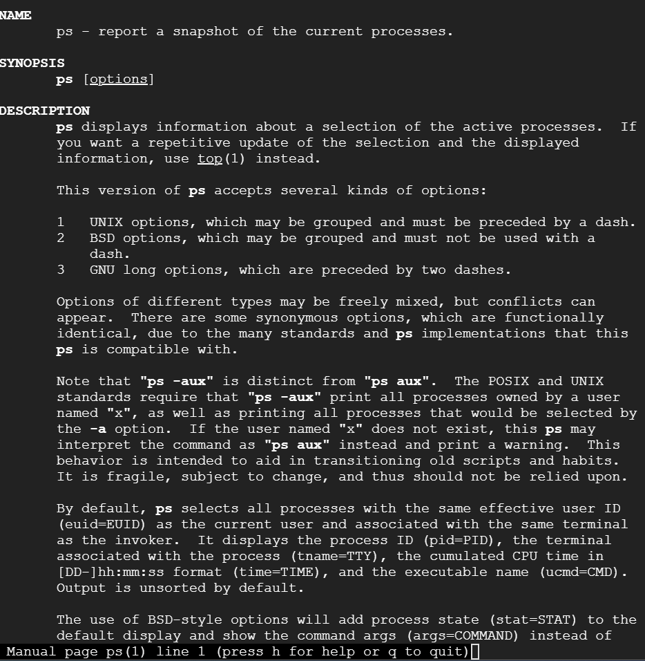 설명을 보여주는 명령어 man을 입력해서 ps에 대해 알아보자!